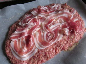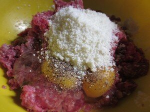 Aggiungete la carne trita, le uova, il pecorino romano, il parmigiano, il sale, il pepe ed impastate bene tutti gli ingredienti con le mani, fino ad ottenere un composto omogeneo. A questo punto stendete accuratamente il composto su un foglio di carta forno cosparso di pane grattugiato. Appiattitelo e adagiate sopra il ripieno che avete scelto (io ho usato la pancetta e le sottilette).