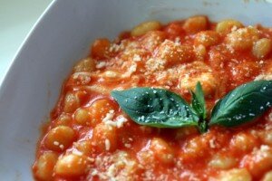 Tagliate la mozzarella a dadini e riponetela in frigo affinché si asciughi. Affettate la cipolla sottilmente e fatela appassire con un filo d’olio per qualche minuto. Aggiungete pomodoro, il basilico, il sale e cuocete per circa 15 minuti a fuoco lento, evitando di far addensare troppo il sugo. Lessate gli gnocchi, scolateli e riponeteli nella pentola di cottura, insieme alla mozzarella e due terzi di sugo di pomodoro. Mescolate ed adagiate il tutto in una pirofila da forno. Ricoprite con il restante sugo e cospargete di parmigiano. Infornate a 200° per 15 minuti.